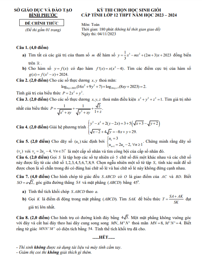 Đề học sinh giỏi cấp tỉnh Toán 12 năm 2023 – 2024 sở GD&ĐT Bình Phước