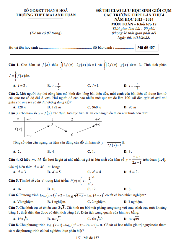 Đề giao lưu HSG Toán 12 lần 4 năm 2023 – 2024 trường THPT Mai Anh Tuấn – Thanh Hóa