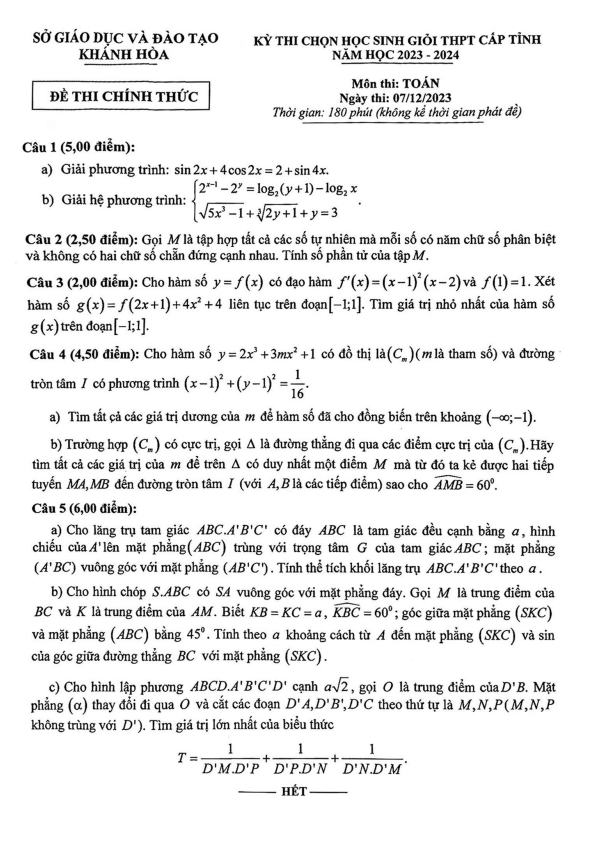 Đề học sinh giỏi cấp tỉnh Toán THPT năm 2023 – 2024 sở GD&ĐT Khánh Hòa