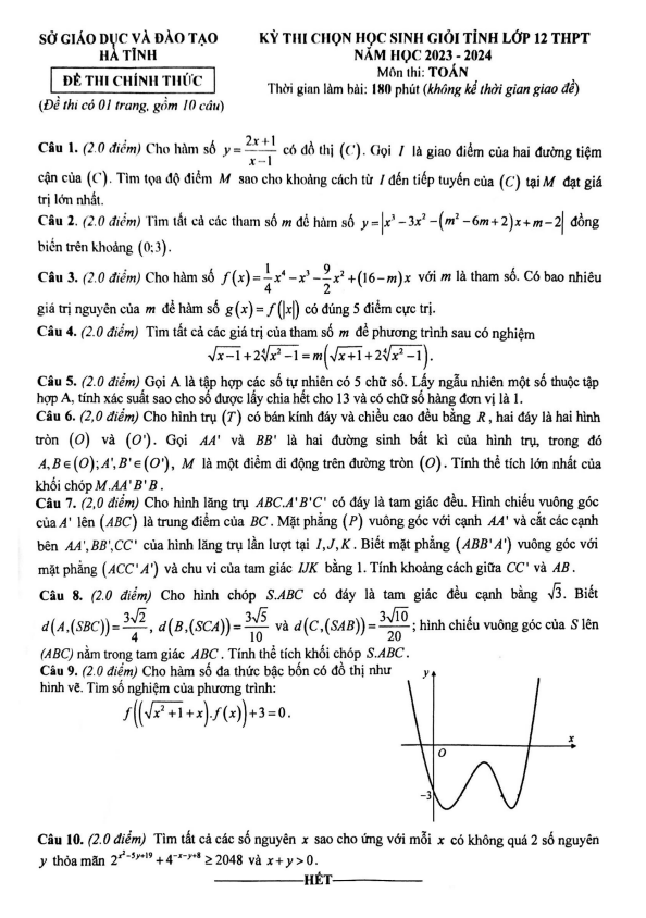 Đề học sinh giỏi tỉnh Toán 12 năm 2023 – 2024 sở GD&ĐT Hà Tĩnh