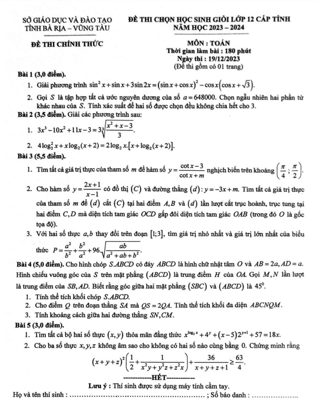 Đề học sinh giỏi Toán 12 cấp tỉnh năm 2023 – 2024 sở GD&ĐT Bà Rịa – Vũng Tàu