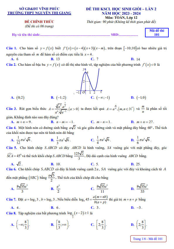 Đề học sinh giỏi Toán 12 lần 2 năm 2023 – 2024 trường THPT Nguyễn Thị Giang – Vĩnh Phúc