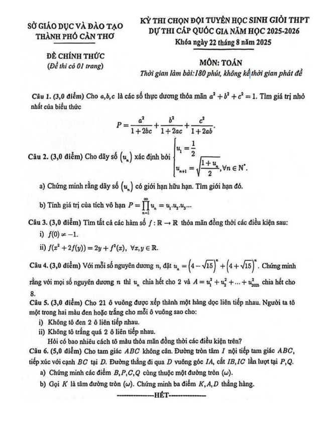 Đề chọn đội tuyển thi HSG QG môn Toán THPT năm 2025 – 2026 sở GD&ĐT Cần Thơ