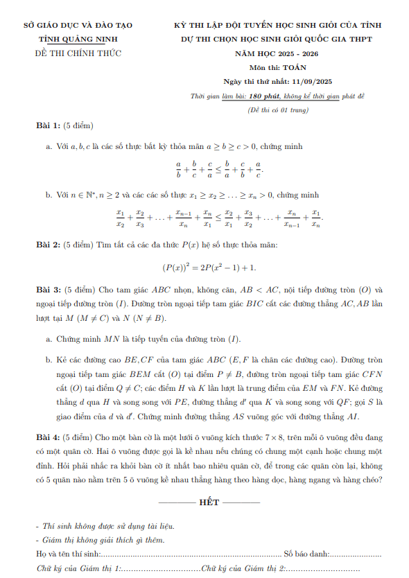 Đề lập đội tuyển thi HSG QG môn Toán THPT năm 2025 – 2026 sở GD&ĐT Quảng Ninh