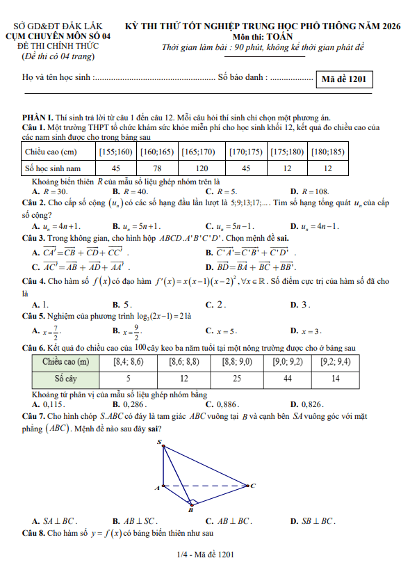 Đề thi thử tốt nghiệp THPT 2026 môn Toán cụm chuyên môn số 04 – Đắk Lắk