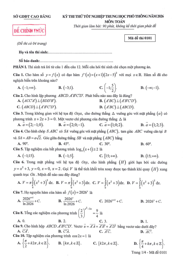Đề thi thử tốt nghiệp THPT năm 2026 môn Toán sở GD&ĐT Cao Bằng