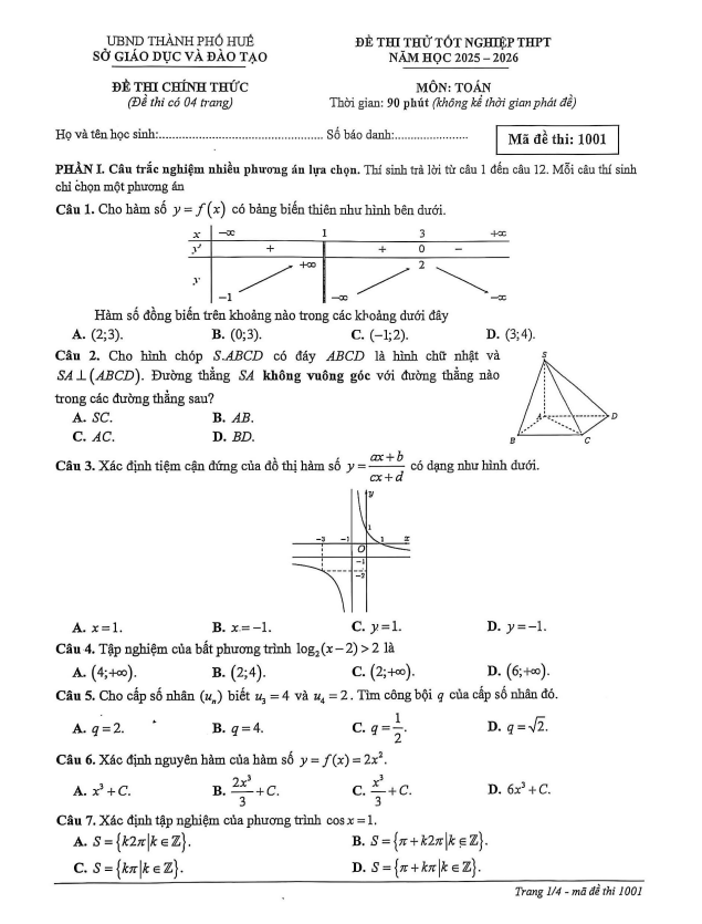 Đề thi thử tốt nghiệp THPT năm 2026 môn Toán sở GD&ĐT Huế
