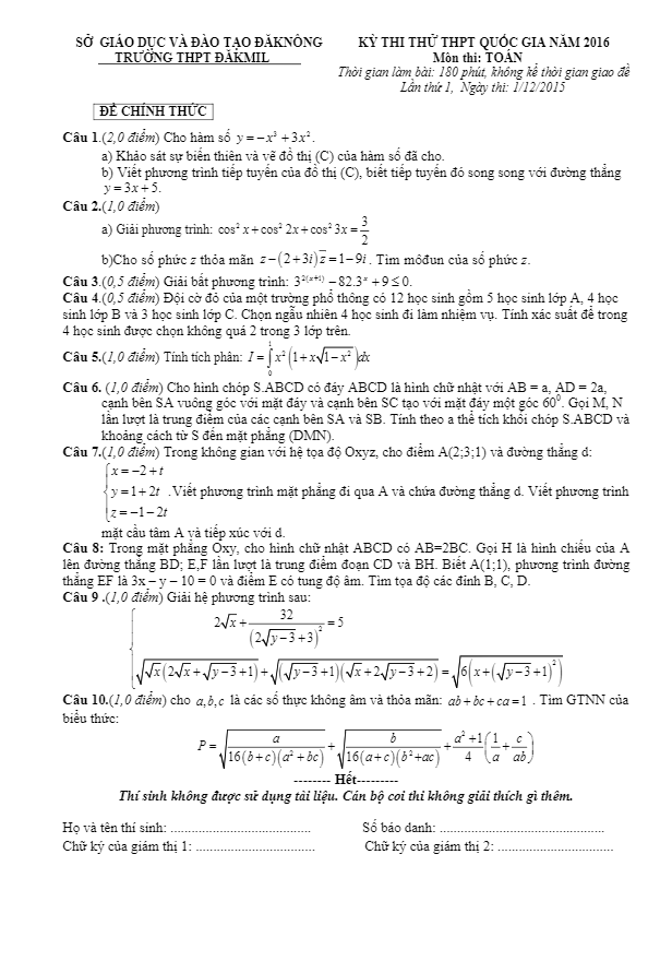 Đề thi thử THPT Quốc gia 2016 môn Toán lần 1 ĐăkMil – ĐăkNông