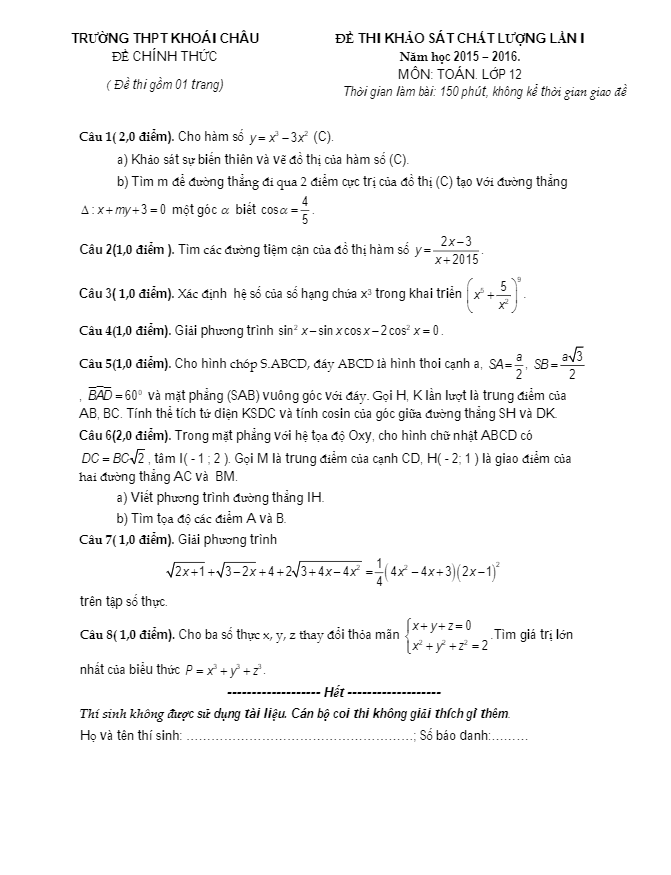 Đề thi thử THPT Quốc gia 2016 môn Toán lần 1 trường THPT Khoái Châu – Hưng Yên