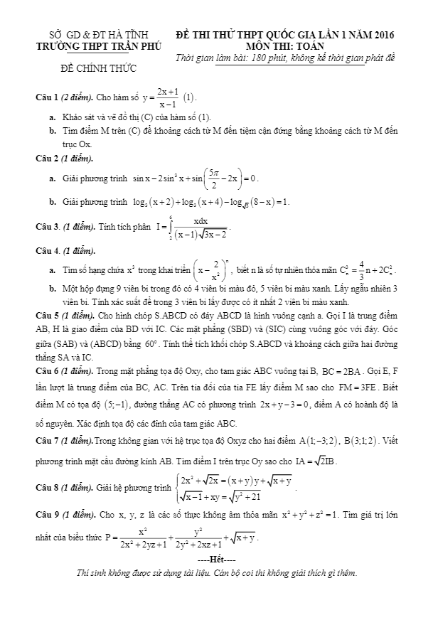 Đề thi thử THPT Quốc gia 2016 môn Toán lần 1 trường THPT Trần Phú – Hà Tĩnh