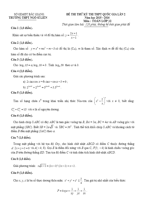 Đề thi thử THPT Quốc gia 2016 môn Toán lần 2 trường THPT Ngô Sĩ Liên – Bắc Giang