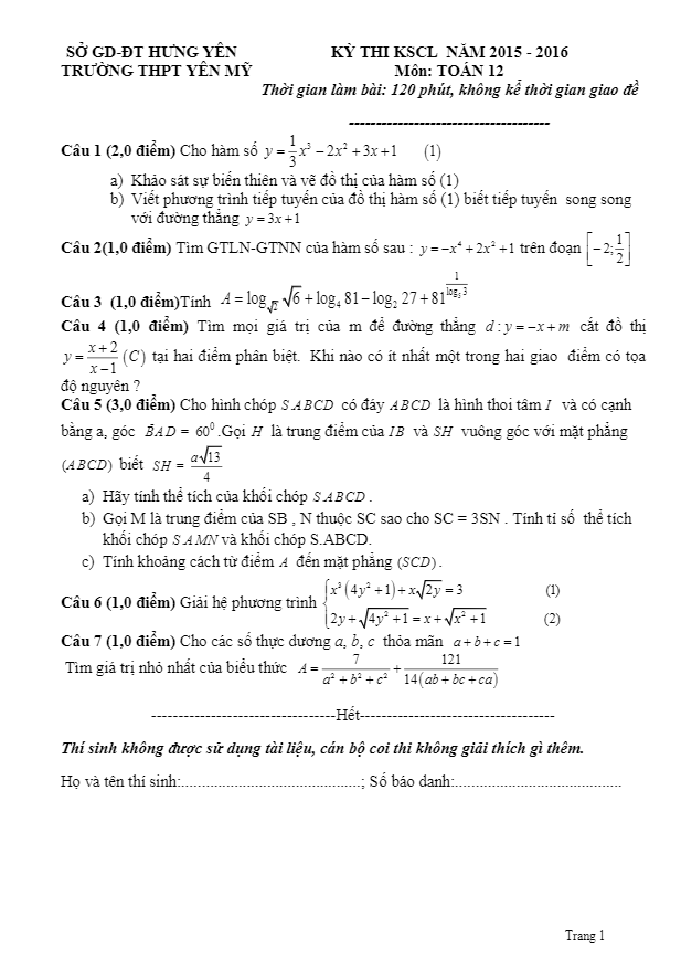 Đề thi thử THPT Quốc gia 2016 môn Toán trường THPT Yên Mỹ – Hưng Yên