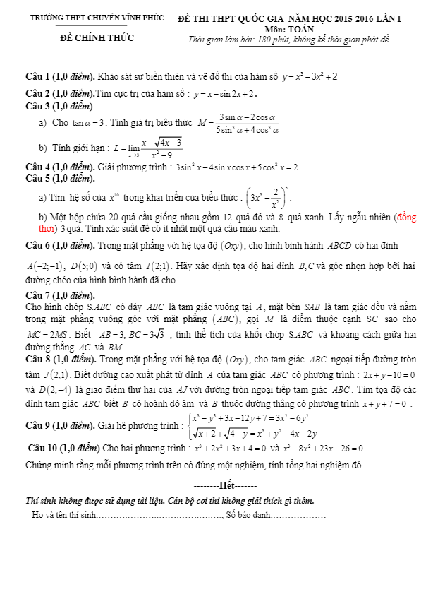 Đề thi thử THPT Quốc gia môn Toán 2016 lần 1 trường THPT chuyên Vĩnh Phúc
