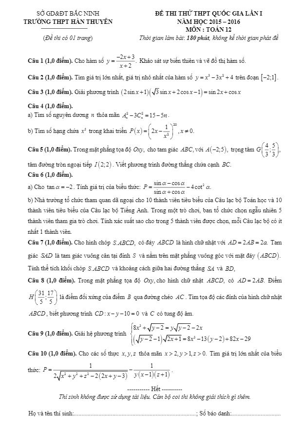 Đề thi thử THPT Quốc gia môn Toán 2016 lần 1 trường THPT Hàn Thuyên – Bắc Ninh