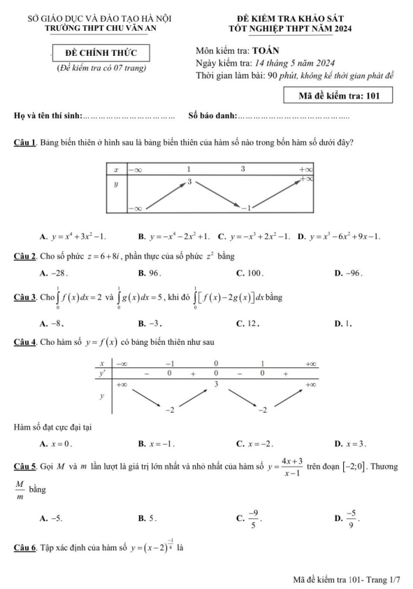 Đề khảo sát Toán tốt nghiệp THPT 2024 trường THPT Chu Văn An – Hà Nội