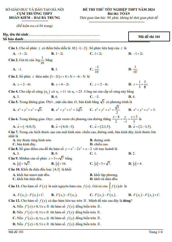 Đề thi thử Toán TN THPT 2024 cụm Hoàn Kiếm & Hai Bà Trưng – Hà Nội