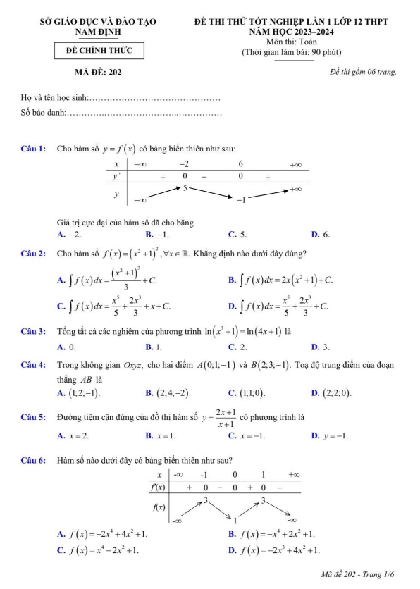 Đề thi thử tốt nghiệp THPT 2024 môn Toán lần 1 sở GD&ĐT Nam Định