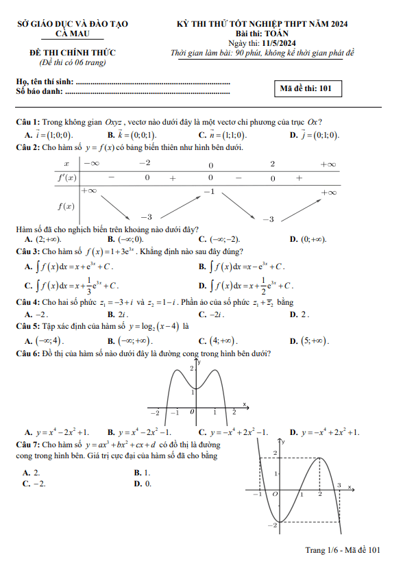 Đề thi thử tốt nghiệp THPT năm 2024 môn Toán sở GD&ĐT Cà Mau