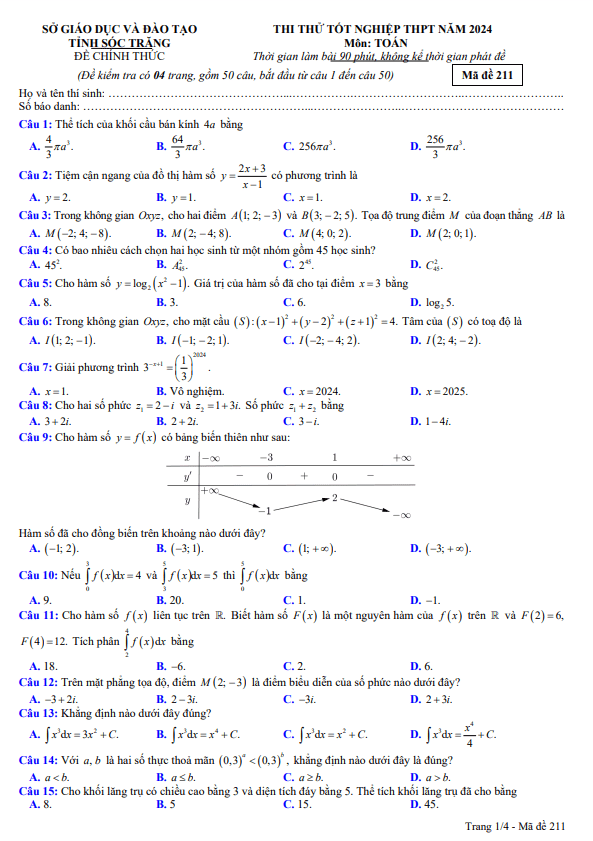 Đề thi thử tốt nghiệp THPT năm 2024 môn Toán sở GD&ĐT Sóc Trăng