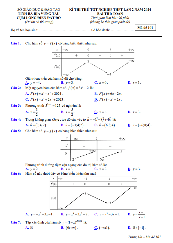 Đề thi thử TN THPT 2024 môn Toán lần 2 cụm Long Điền Đất Đỏ – BR VT