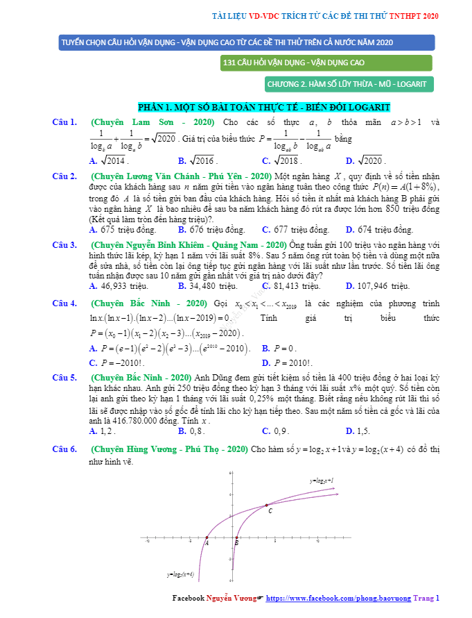 160 câu vận dụng cao mũ – logarit ôn thi THPT môn Toán