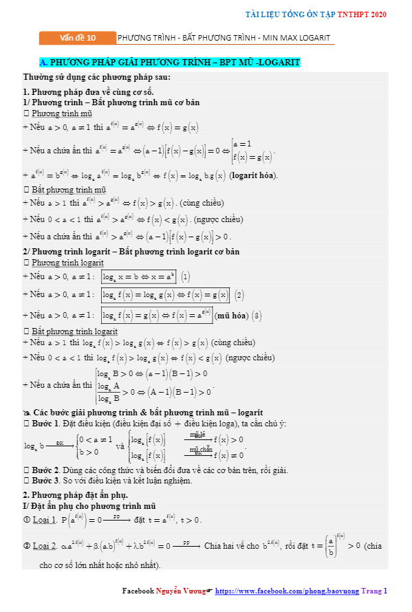 Tổng ôn tập TN THPT 2020 môn Toán: Phương trình – bất phương trình – GTLN – GTNN mũ và logarit