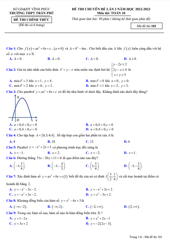 Đề thi chuyên đề Toán 10 lần 3 năm 2022 – 2023 trường THPT Trần Phú – Vĩnh Phúc