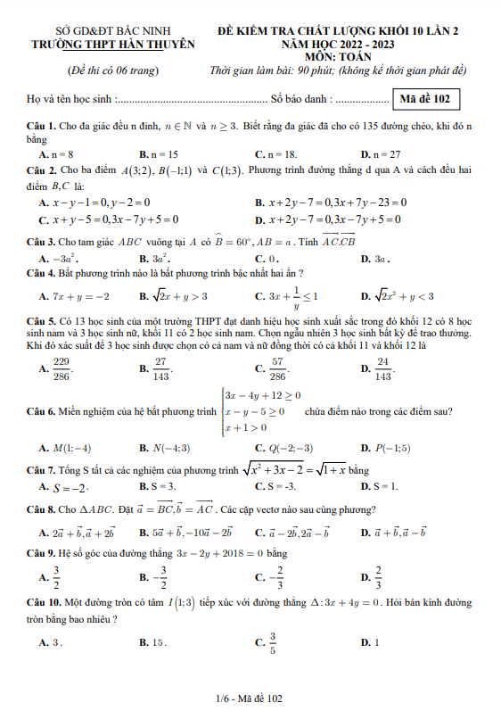 Đề kiểm tra Toán 10 lần 2 năm 2022 – 2023 trường THPT Hàn Thuyên – Bắc Ninh