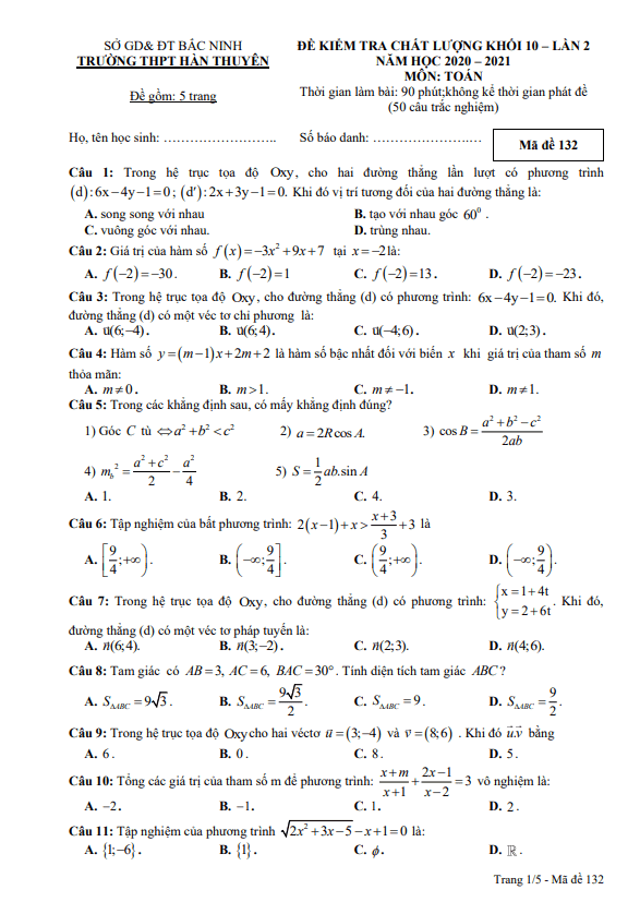Đề kiểm tra Toán 10 lần 2 năm 2020 – 2021 trường Hàn Thuyên – Bắc Ninh