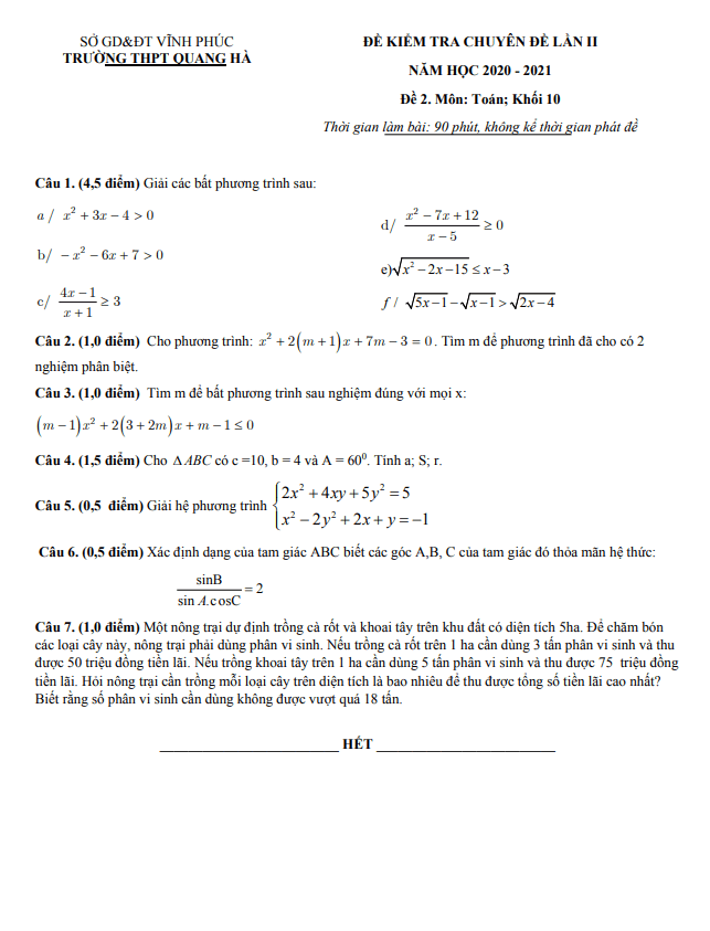 Đề kiểm tra Toán 10 lần 2 năm 2020 – 2021 trường THPT Quang Hà – Vĩnh Phúc