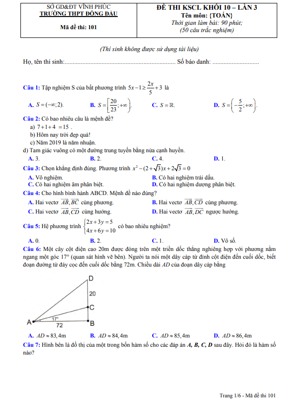 Đề KSCL Toán 10 lần 3 năm 2020 – 2021 trường THPT Đồng Đậu – Vĩnh Phúc
