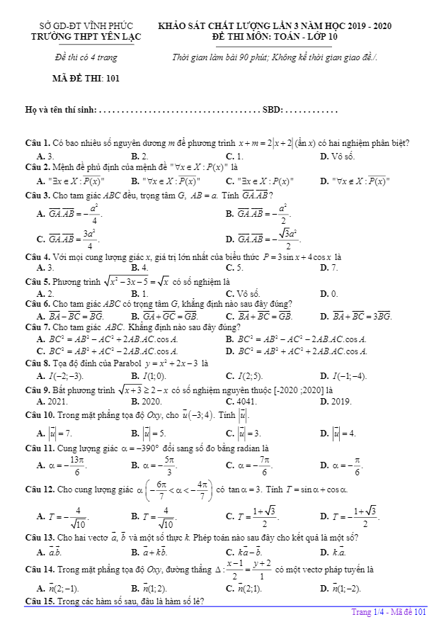 Đề KSCL Toán 10 lần 2 năm 2019 – 2020 trường THPT Yên Lạc 2 – Vĩnh Phúc