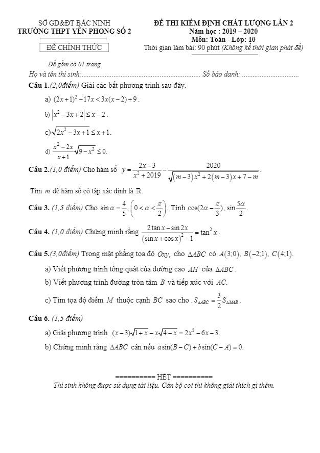 Đề kiểm định chất lượng Toán 10 lần 2 năm 2019 – 2020 trường THPT Yên Phong 2 – Bắc Ninh