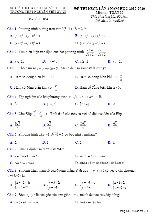 Đề KSCL Toán 10 lần 4 năm 2019 – 2020 trường THPT Nguyễn Viết Xuân – Vĩnh Phúc