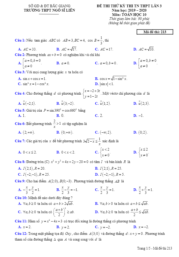 Đề thi thử TN THPT 2020 lần 3 môn Toán 10 trường THPT Ngô Sĩ Liên – Bắc Giang