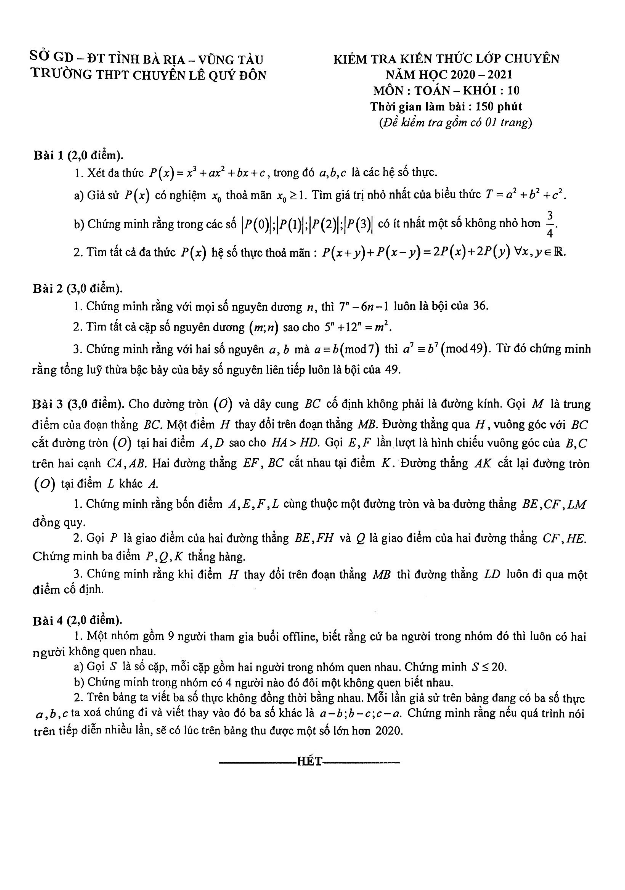 Đề kiểm tra kiến thức lớp chuyên Toán 10 năm 2020 – 2021 trường chuyên Lê Quý Đôn – BR VT