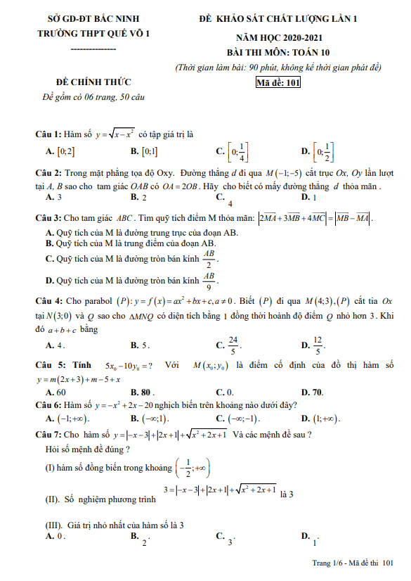 Đề khảo sát chất lượng lần 1 Toán 10 năm 2020 – 2021 trường Quế Võ 1 – Bắc Ninh