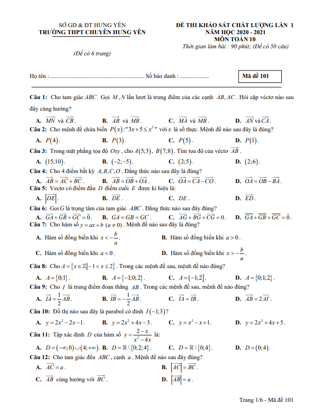 Đề khảo sát chất lượng Toán 10 lần 1 năm 2020 – 2021 trường THPT chuyên Hưng Yên
