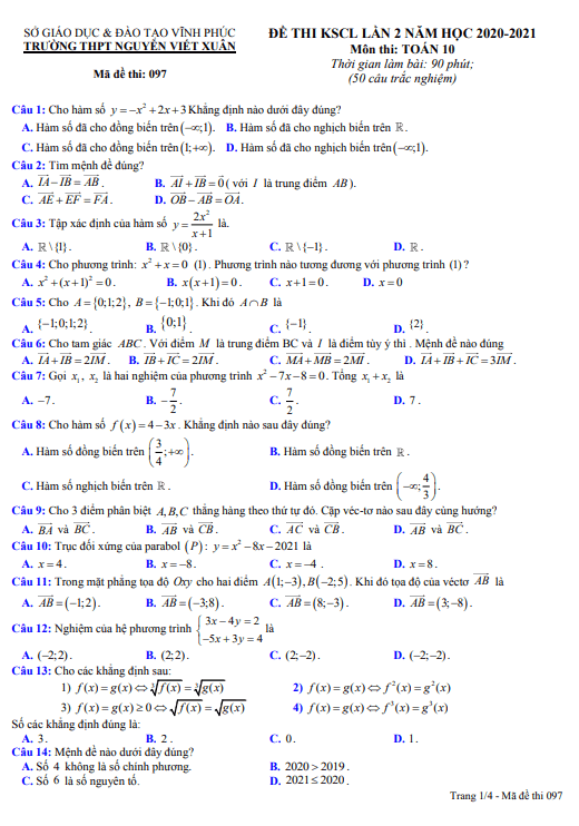 Đề KSCL lần 2 Toán 10 năm 2020 – 2021 trường THPT Nguyễn Viết Xuân – Vĩnh Phúc