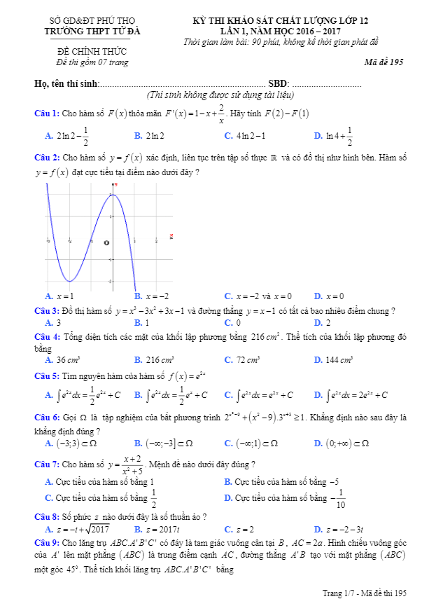 Đề khảo sát chất lượng Toán 12 năm học 2016 – 2017 trường THPT Tử Đà – Phú Thọ lần 1