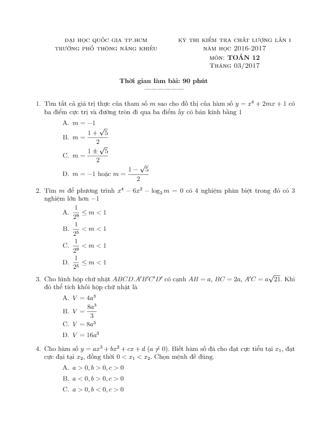 Đề kiểm tra chất lượng Toán 12 năm học 2016 – 2017 trường Phổ thông Năng khiếu – TP.HCM lần 1