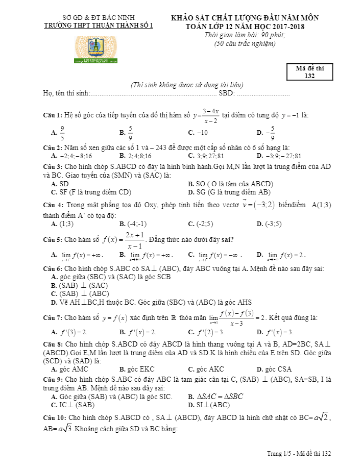 Đề KSCL đầu năm lớp 12 năm học 2017 – 2018 môn Toán trường THPT Thuận Thành 1 – Bắc Ninh