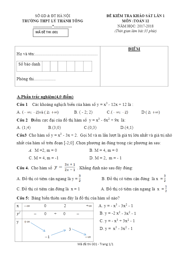 Đề kiểm tra khảo sát môn Toán 12 trường THPT Lý Thánh Tông – Hà Nội lần 1