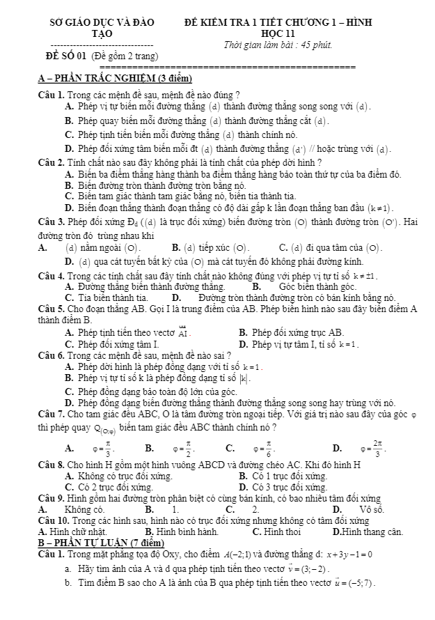 Các đề kiểm tra Hình học 11 chương 1 bao gồm các đề kiểm tra 1 tiết (45 phút), đề kiểm tra định kỳ cuối chương … theo hình thức trắc nghiệm, tự luận, hoặc trắc nghiệm kết hợp với tự luận.