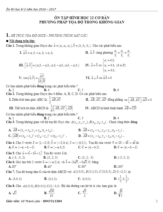 Tuyển tập các tài liệu môn Toán hay nhất về chủ đề PHƯƠNG PHÁP TOẠ ĐỘ TRONG KHÔNG GIAN trong chương trình môn Toán lớp 12, bao gồm các nội dung: Toạ Độ Của Vectơ Đối Với Một Hệ Trục Toạ Độ; Biểu Thức Toạ Độ Của Các Phép Toán Vectơ; Phương Trình Mặt Phẳng; Phương Trình Đường Thẳng Trong Không Gian; Phương Trình Mặt Cầu.