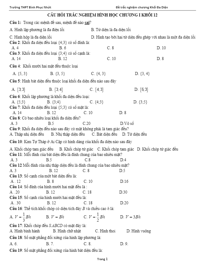 75 câu trắc nghiệm khối đa diện – THPT Bình Phục Nhứt, Tiền Giang