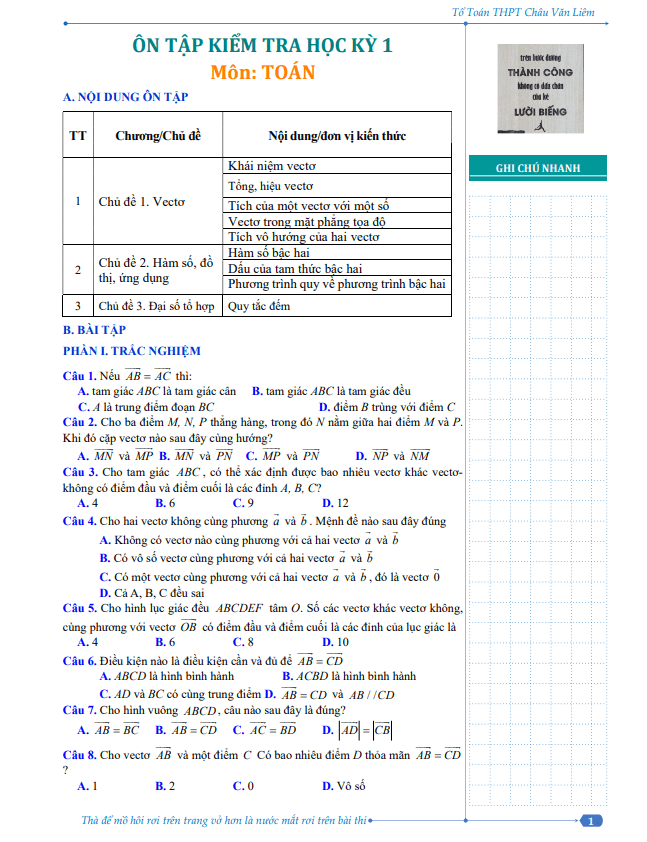 Đề cương học kỳ 1 Toán 10 năm 2023 – 2024 trường THPT Hoàng Văn Thụ – Hà Nội