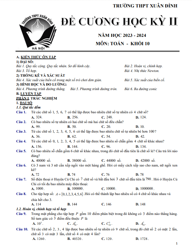 Đề cương học kỳ 2 Toán 10 năm 2023 – 2024 trường THPT Xuân Đỉnh – Hà Nội