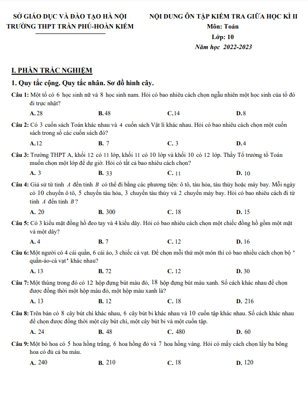 Đề cương giữa kỳ 2 Toán 10 năm 2022 – 2023 trường Hoàng Văn Thụ – Hà Nội