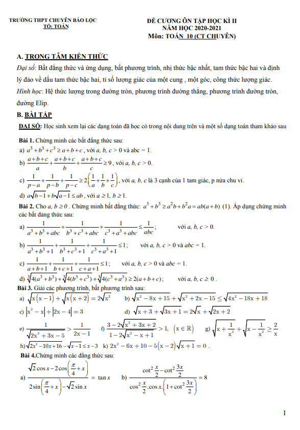 Đề cương HK2 Toán 10 năm 2020 – 2021 trường chuyên Bảo Lộc – Lâm Đồng